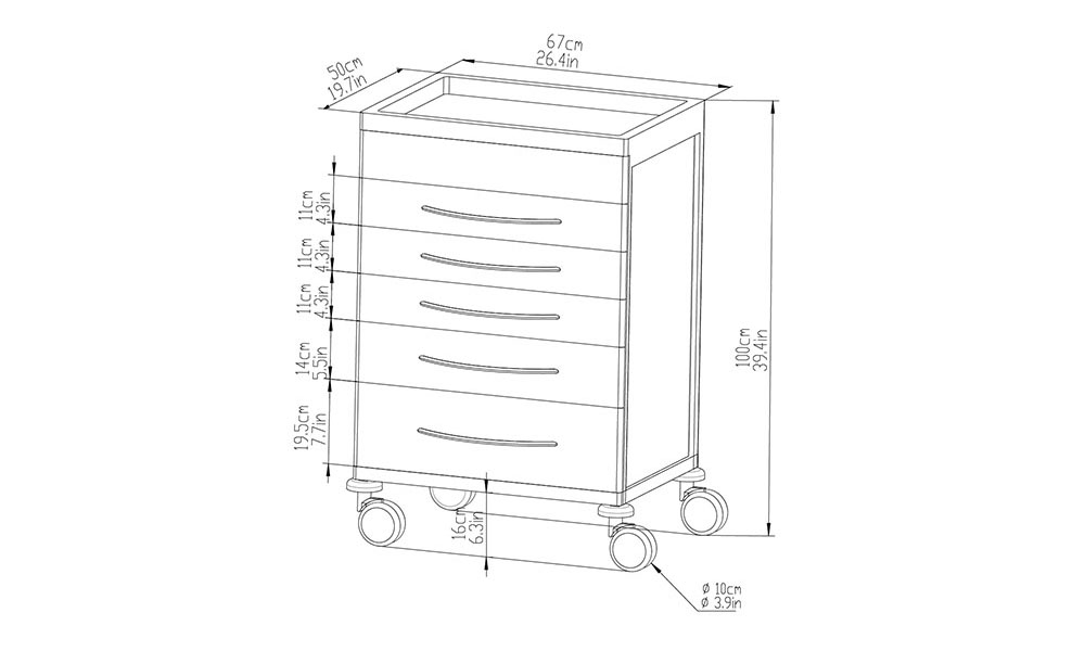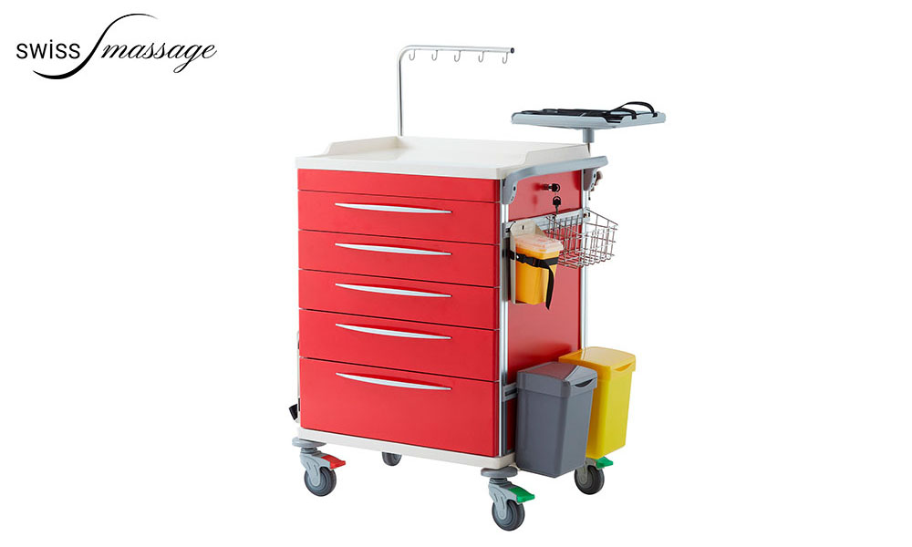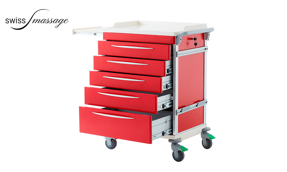 Ausgestattet mit fünf abschließbaren Schubladen kann der Arztwagen mit einer ausziehbaren Ablage erweitert werden.