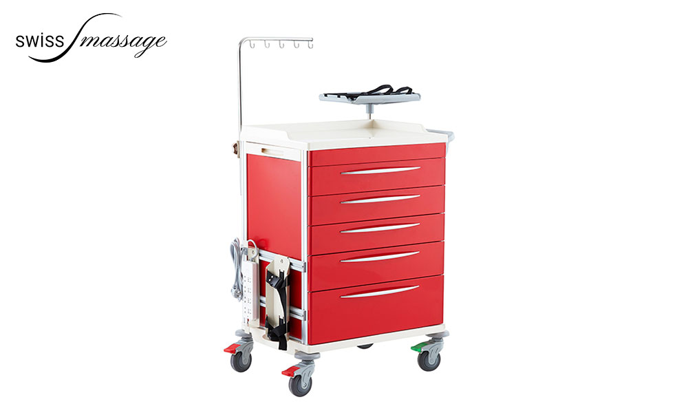 1 Defibrillator-Regal 5 Schubladen 1 Sauerstofftankhalter 1 CPR-Tafel 2 Mülleimer 1 Drahtkorb aus Edelstahl 1 Steckdosenpad 1 ausziehbare Seitenablagen zum Organisieren von Schubladen Soft-Close-Schieber Abschließbare Räder mit Schlüssel Mittelschloss