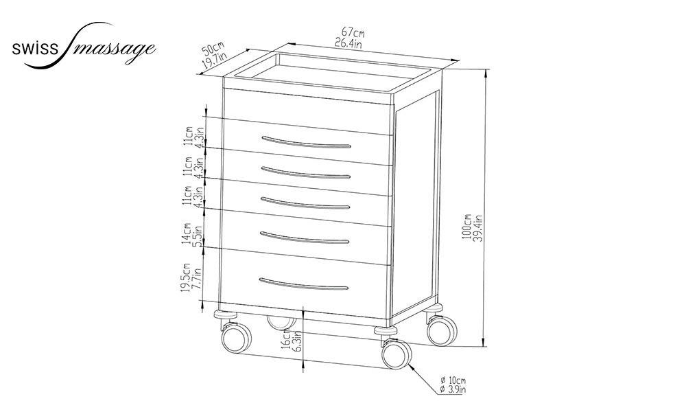 Width: 67 cm Depth: 50 cm Height: 100 cm (surface) Ø wheel: 10 cm Weight: 72 kg Max load: 50 kg / drawer Material: aluminium alloy and ABS Surface: ABS White Colour: Blue
