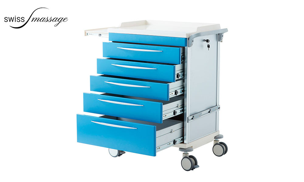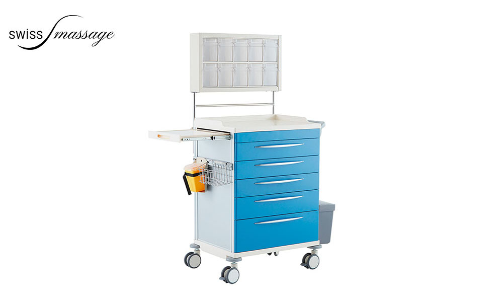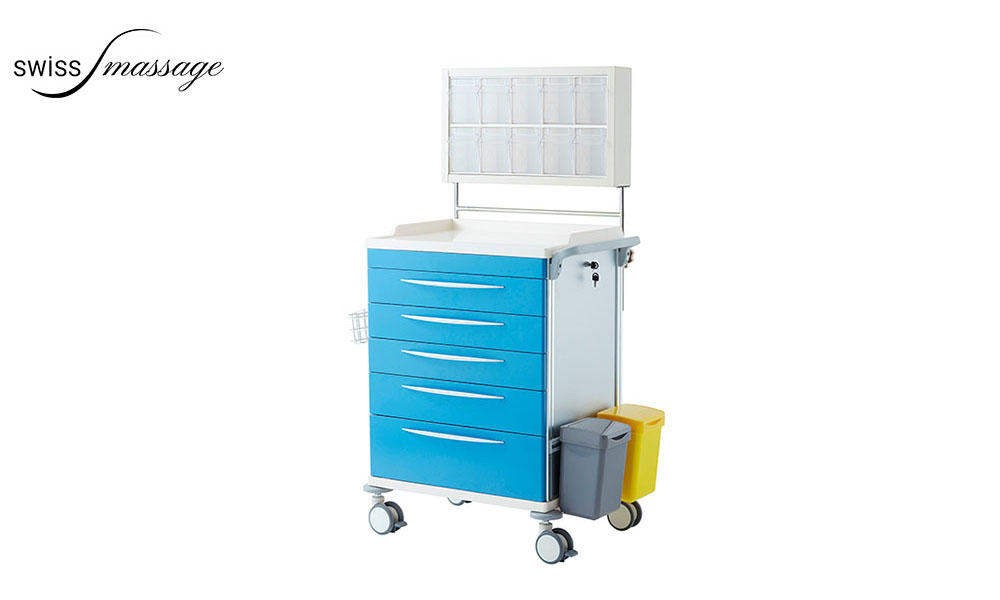 Equipped with five lockable drawers, the medical trolley can be extended with an extendable shelf.
