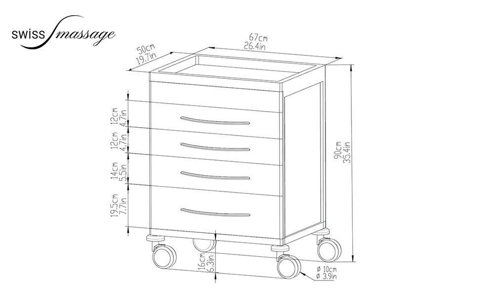 Width: 67 cm Depth: 50 cm Height: 90 cm Ø wheel: 10 cm Weight: 42 kg Max load: 50 kg / drawer Material: aluminium alloy and ABS Surface: white ABS Colour: Grey