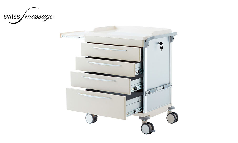 Equipped with four lockable drawers, the medical trolley can be extended with an extendable shelf.