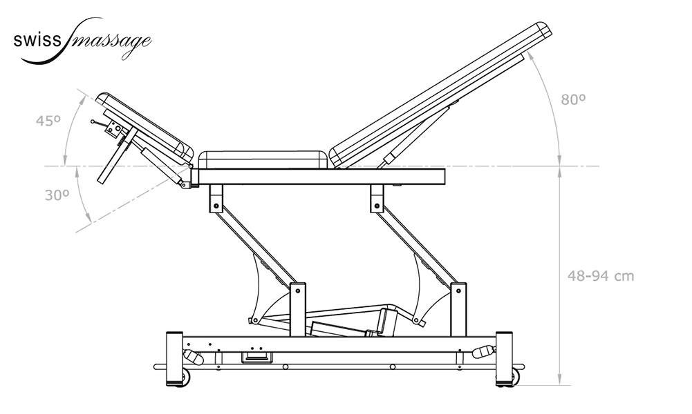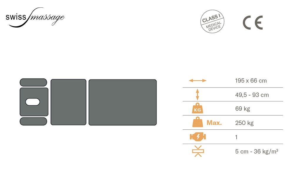 With its generous dimensions – a total length of 195 cm, a width of 66 cm and an adjustable height from 50 cm to 94 cm – this table offers optimal comfort for patients of all sizes and is an ideal choice for demanding practitioners.